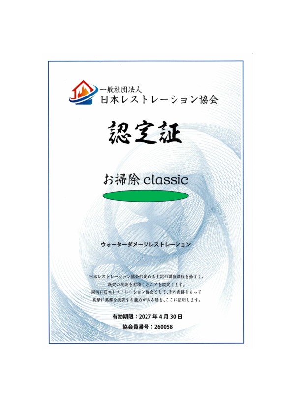 日本レストレーション協会「JRES」加盟 こんにちは!お掃除classicです。 近年の気温の上昇の影響もあるのか、水害被害が以前よりも多くなったと感じています。 そんな自然災害に対応できるよう日本レストレーション協会「JRES」による ウォーターダメージレストレーション(水害復旧)の講習会に参加しました。 日本レストレーション協会「JRES」は、レストレーションという産業を日本国内に普及すべく、 下記を事業理念として活動しています。 ①水害・火災に被災した人が1日でも早く日常を取り戻すための価値 ②安心・安全な室内環境という価値 ③健康を脅かす菌・カビ・臭い・汚れなどを取り除き衛生的な環境をつくるという価値 ④地域社会を守るためのディザスターレストレーション(災害復旧) という価値を皆様に提供します。 レストレーションとは、『復旧・復元』という意味です。 災害で流れ込んだ汚水には色々な菌が存在します。そして濡れた状態が続くと必ずカビも発生します。 汚泥や水を取り除き送風機で表面を乾燥させただけでは衛生的ではありません。 被害にあった箇所を一日でも早く災害を受ける前の近い状態まで環境を整え、 衛生的な室内環境で日常生活を送れるように『復旧・復元』していきます。 水害は自然災害だけではありません。配管からの漏水なども被害の一つです。 自然災害だけでなく、日常に起こる水害も含めて、一日でも早い『復旧・復元』(レストレーション)の お力になりたいと考えております。 お困りの際はお掃除classicまでご相談ください。 まとめ クリーンな環境で生活をすることは衛生的にもとても重要です。 お掃除classicはアメリカで設立された権威ある団体「IICRC」や カビ処理システム「Goldmorrマスターテクニシャン」のライセンスを取得しております。 須坂市や近隣市町村だけでなく、長野県内全域、近隣県でも可能であればお伺いいたします。 ぜひお掃除classicのクリーニングサービスをご利用ください。 各お問い合わせよりお気軽にご相談ください。 お問い合わせ先 -